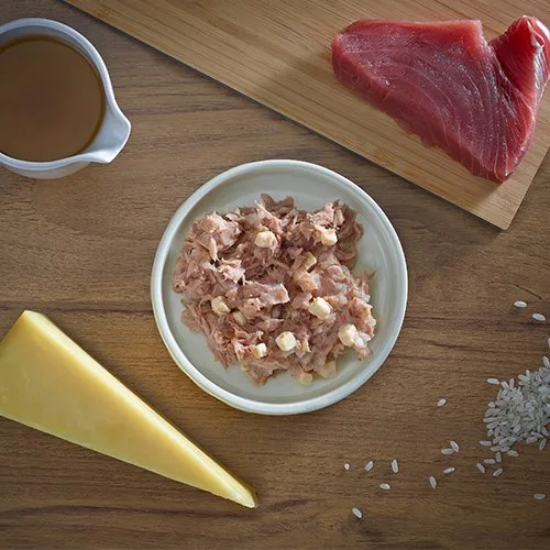 ツナベースにチーズと、食感を良くするためにライスに加え栄養抜群のフィッシュスープのみという贅沢な缶詰シリーズ。