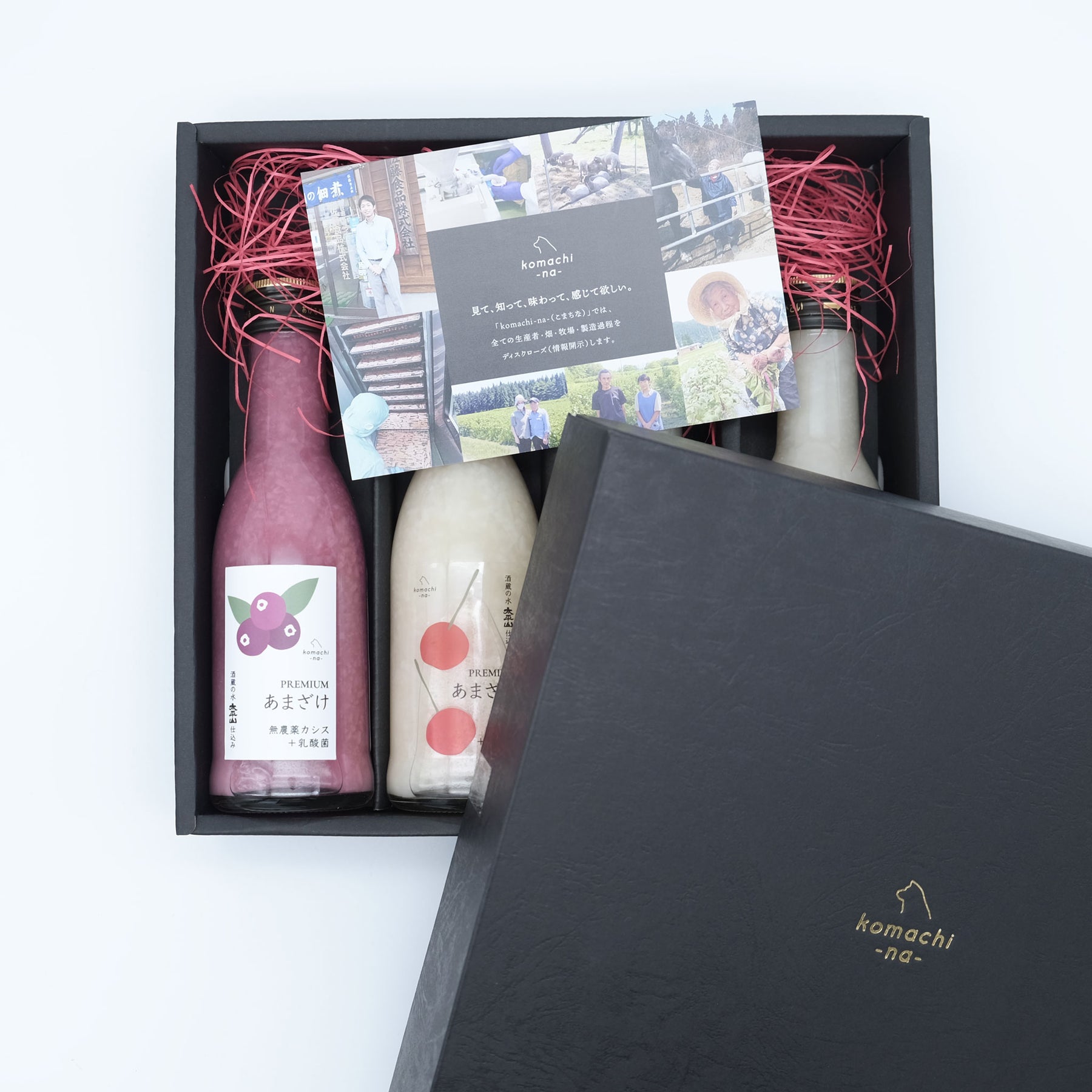 特別な日のお祝いや、贈り物に最適。プレミアムあまざけ4種がセットになったギフトボックス。